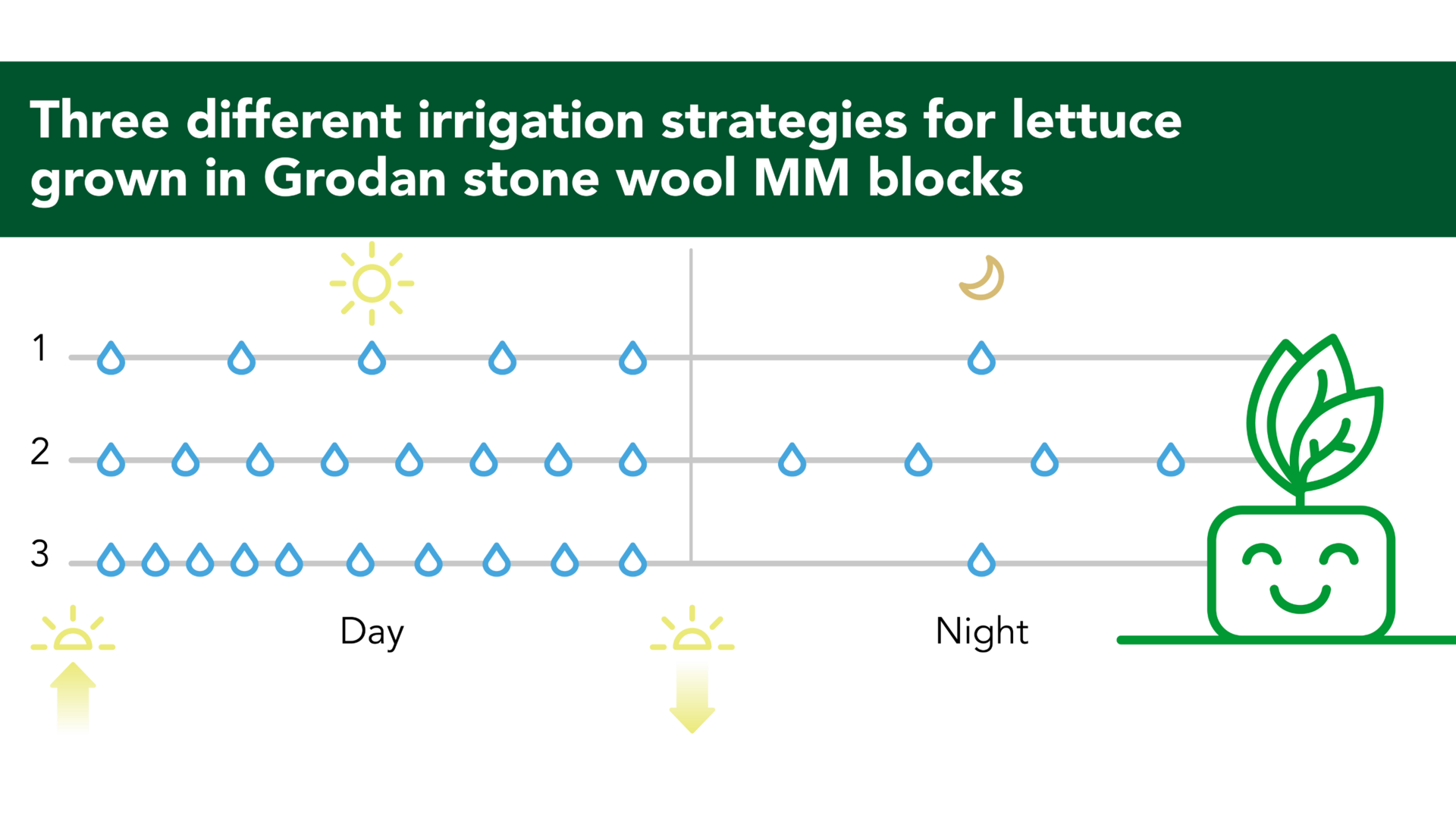 Many growers using stone wool apply a traditional irrigation strategy, meaning they keep their irrigation frequency the same over 24 hours. This is somewhat understandable, because they don’t want to risk the crop drying out irretrievably. But we want our growers to get the most out of our stone wool. Therefore, we decided to combine our long-standing experience with the expertise at the research centre to investigate various irrigation strategies based on adjusted irrigation frequencies using stone wool growing media.