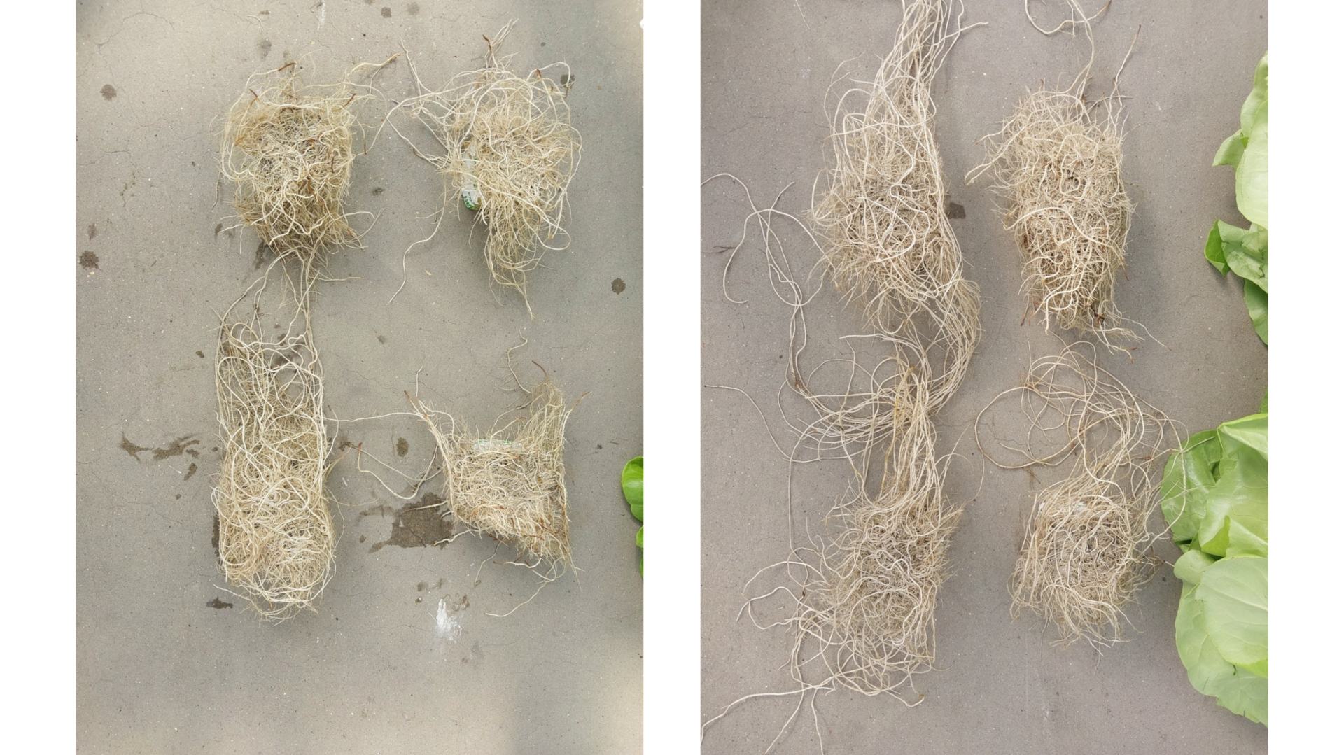 Figure 1: Root growth and quality at harvest time of a Reference stone wool grower’s strategy (left) and Optimised irrigation strategy (right).